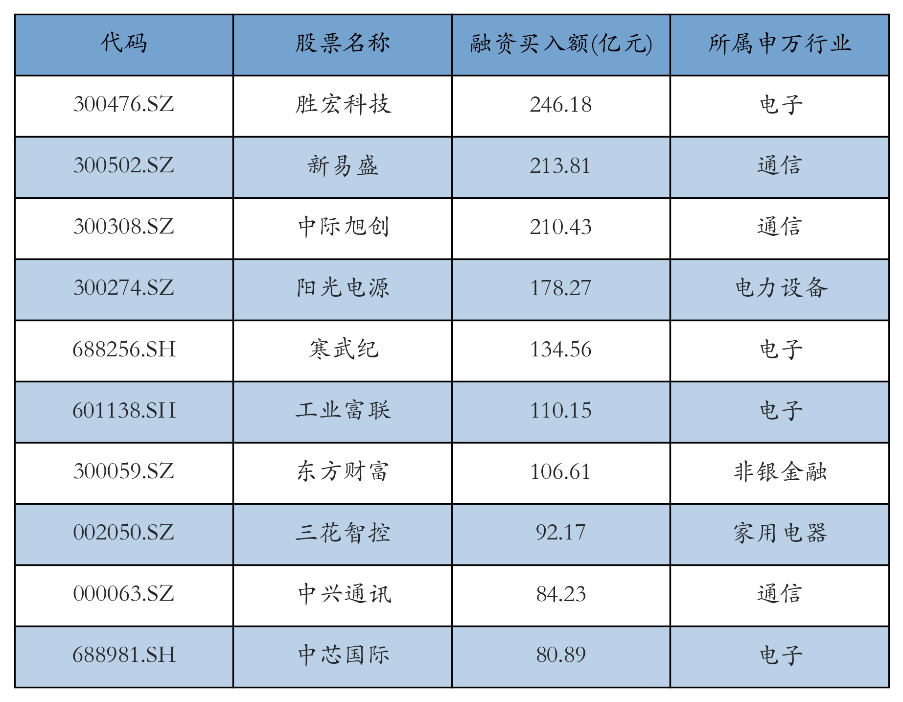 上周两市共有3457只个股有融资资金买入,共有243只个股买入金额超10亿元,其中胜宏科技、新易盛、中际旭创排名前三,买入金额分别246.18亿元、213.81亿元、210.43亿元。融资买入额前10个股详情见下表: